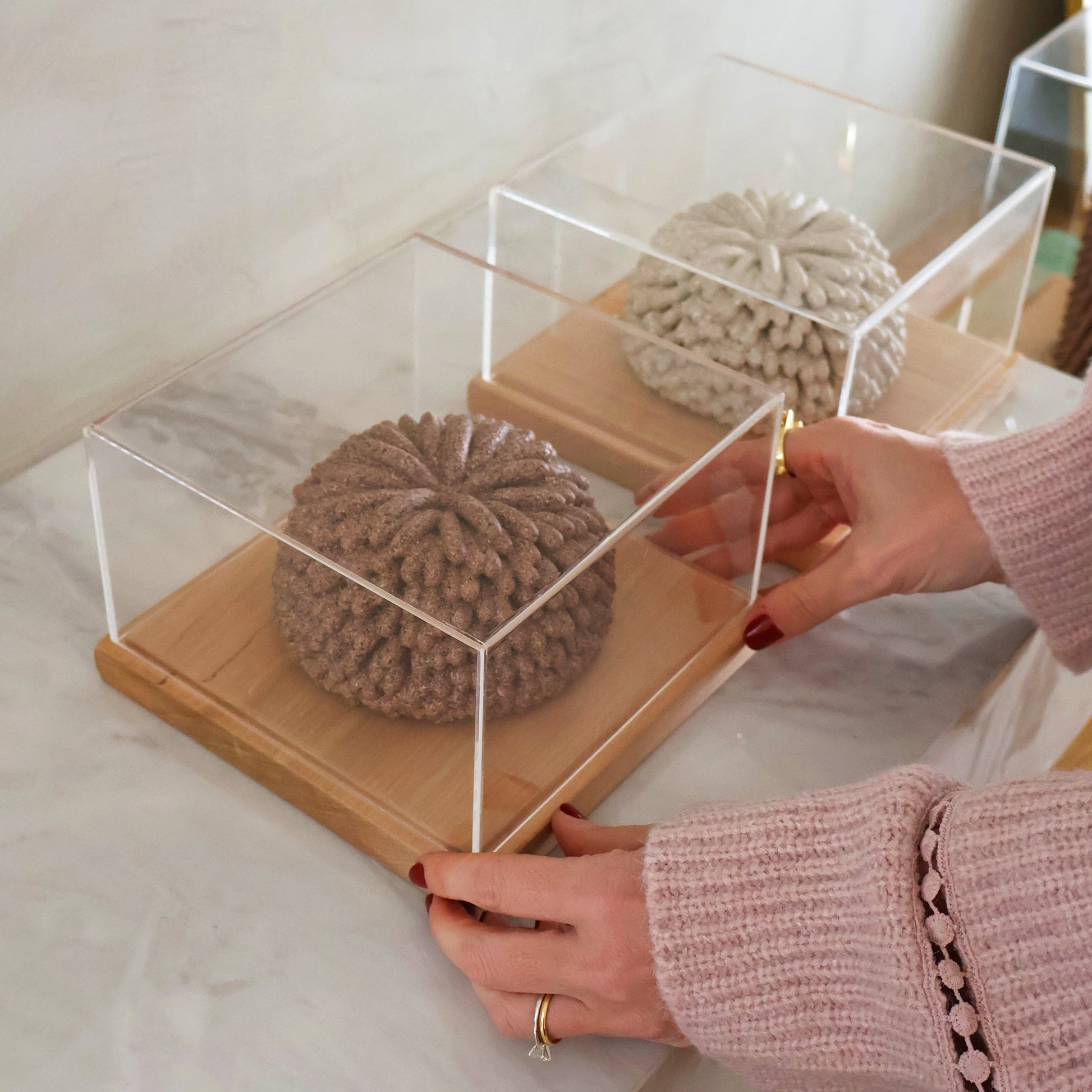 A intervenção manual torna cada peça única e especial. A linha fluffy nasceu da inconstância, da aleatoriedade e da beleza de remar contra a maré. Com base em madeira e cúpula em acrílico, é a combinação perfeita para compor a sua casa.