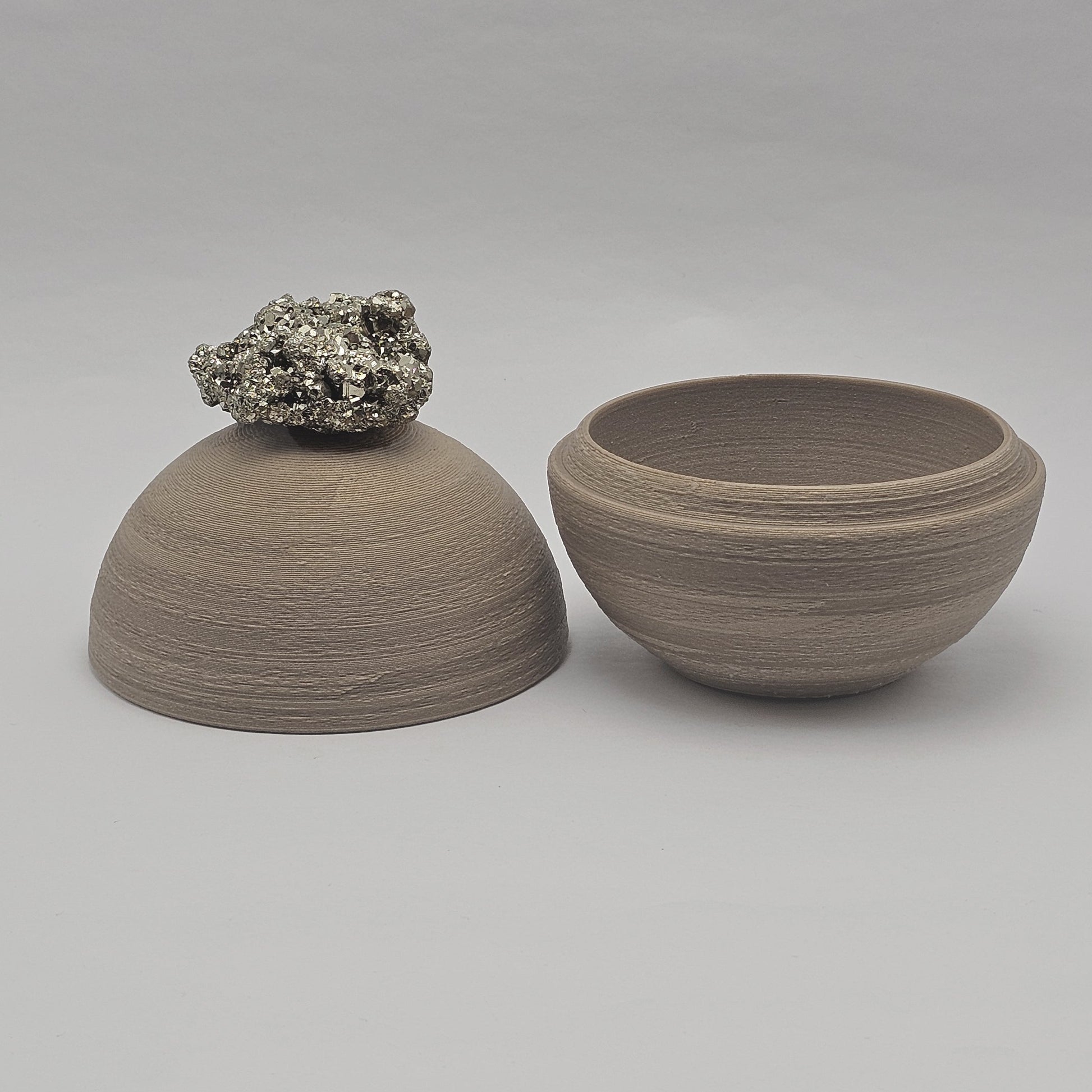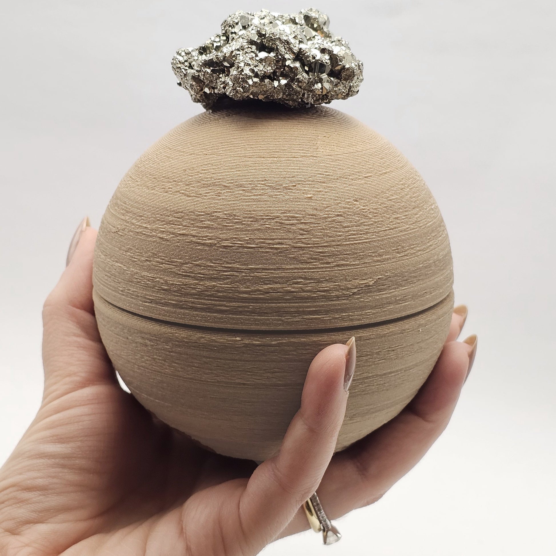 Finalizado com uma pirita, pedra conhecida por atrair prosperidade, proteção e energia vital, o Vasetto é mais que um objeto de decoração: é um amuleto de boas-vindas.